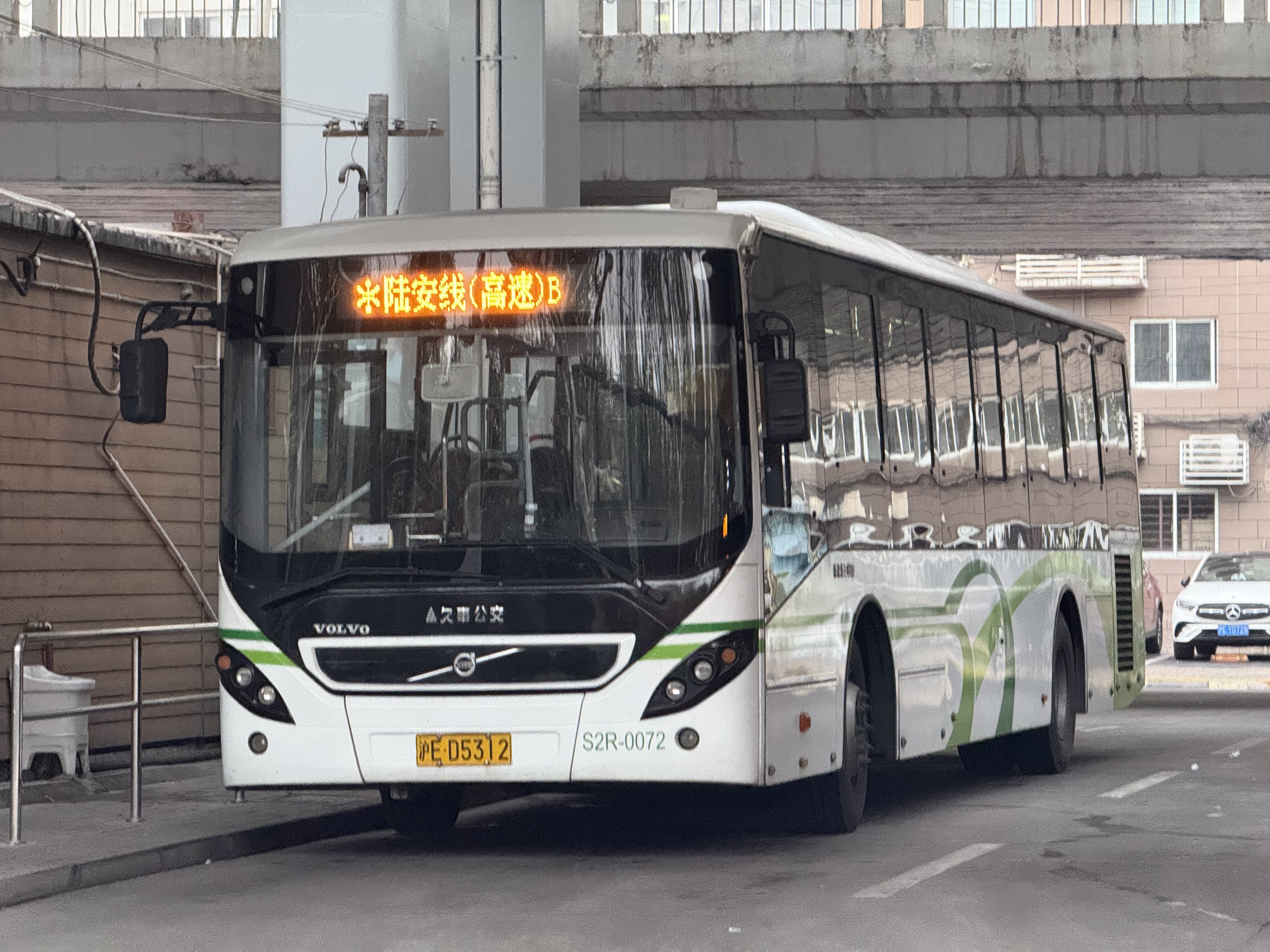 SWB6128V8 (沃尔沃)巴士三公司七车队自编号S2R-0072陆安(高速)B线在终点站中山北路中潭路等待发车前往黄渡汽车站 |